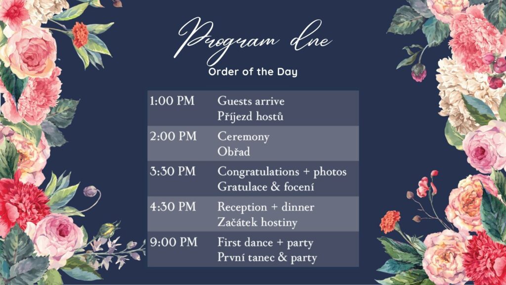 “Moc se těšíme, až spolu s námi oslavíte začátek našeho manželství! Vaše přítomnost na naší svatbě je ten nejlepší dar, co nám můžete dát. Jsme ale také moc vděční všem, kdo by nás rádi něčím obdarovali!